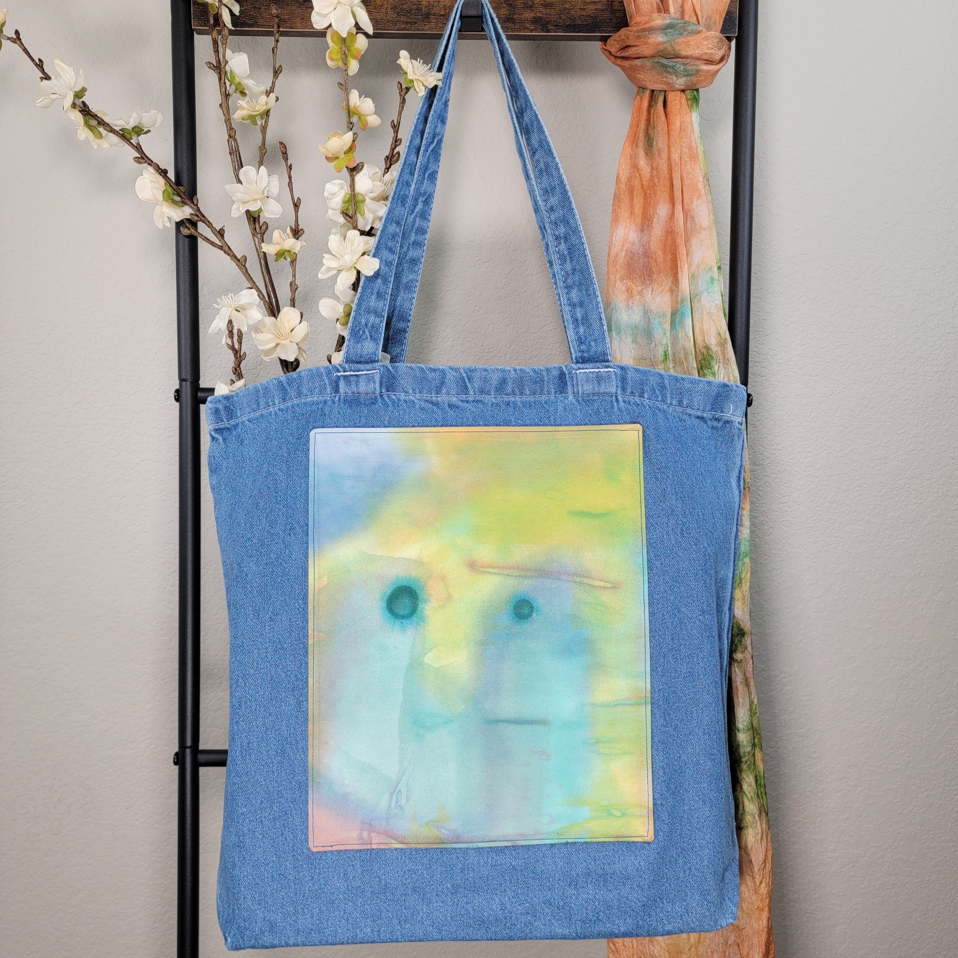 - Material: Denim tote, 100% silk fabric digitally printed on