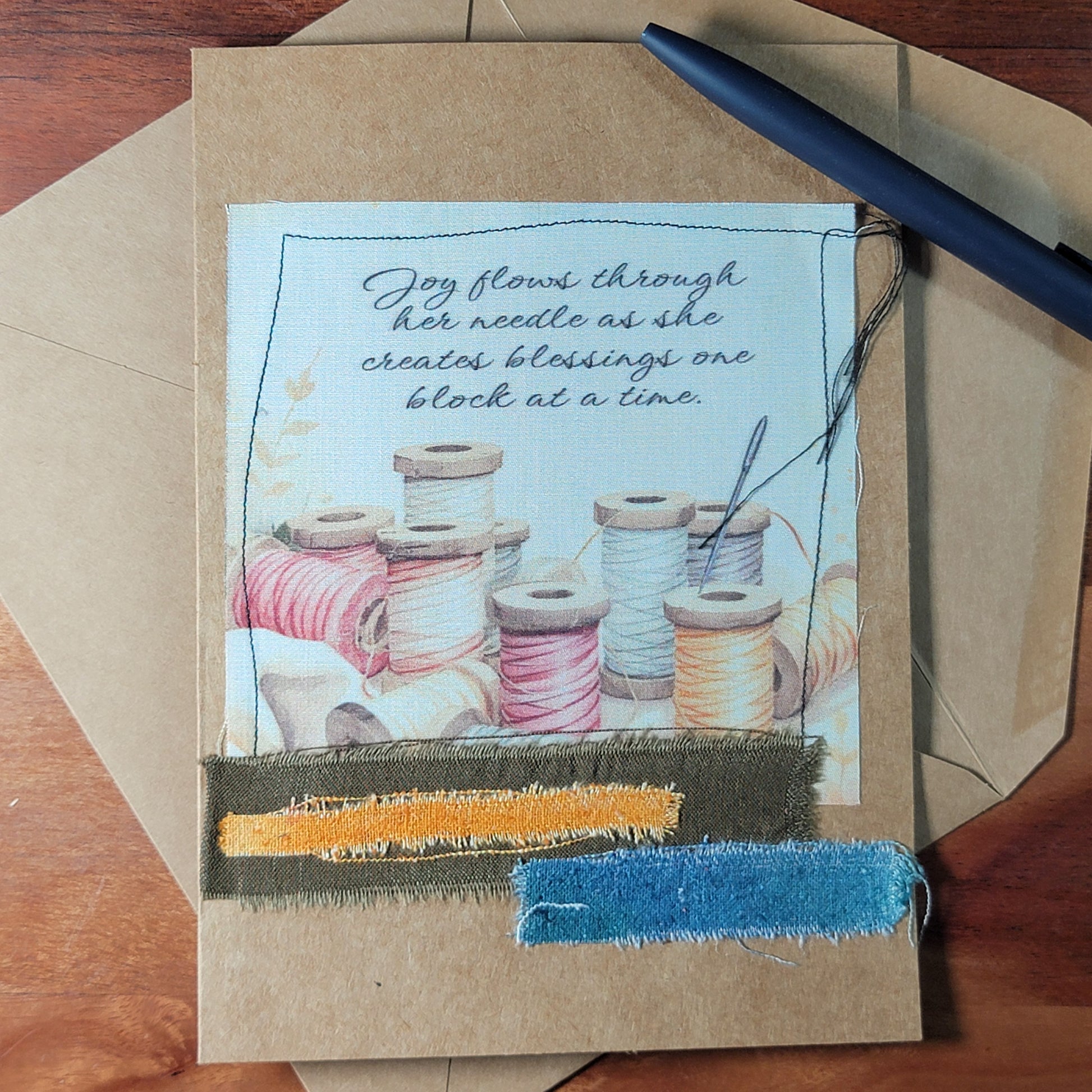 Fabric Art Card - Joy flows through her needle as she creates blessings one block at a time