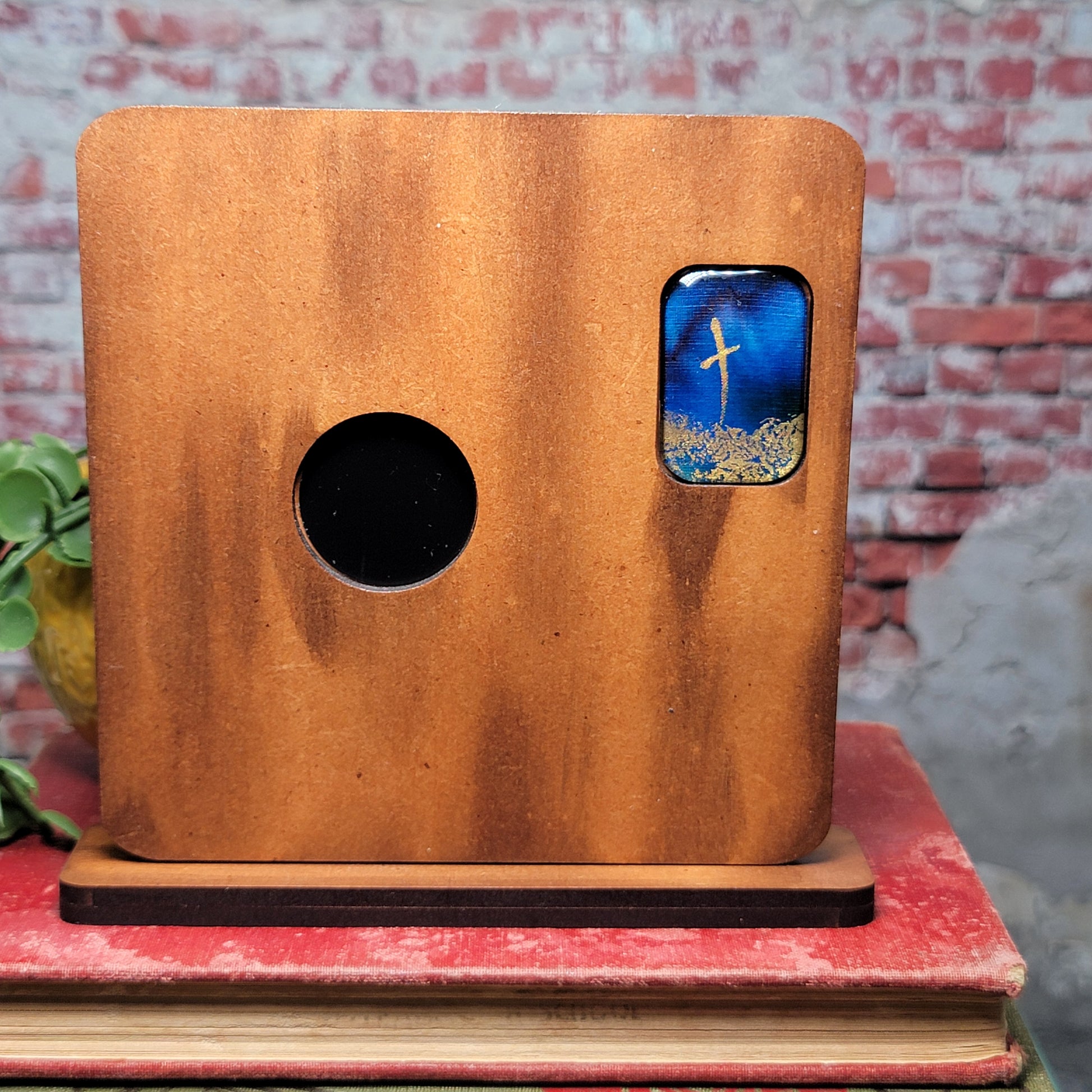 Introducing my custom-created Wood Magnet Frame with a hand-dyed silk gem with a gold metallic cross painted inside it. The frame becomes the ultimate solution for displaying your cherished magnets with style and flexibility. This high-quality frame, available in sleek brown and black finishes, features a unique design that allows you to easily interchange the magnets, making it perfect for showcasing different designs or messages.